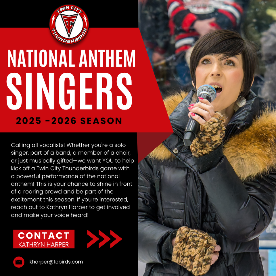 The Twin City Thunderbirds are looking for passionate vocalists to perform the national anthem during the 2025–2026 season. Whether you’re a soloist, choir member, or part of a band, this is your moment to shine.