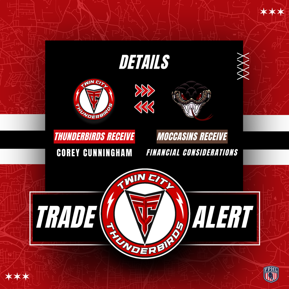 WINSTON-SALEM, N.C. – The Twin City Thunderbirds, proud members of the Federal Prospects Hockey League (FPHL), have acquired forward Corey Cunningham from the Monroe Moccasins in exchange for financial considerations.