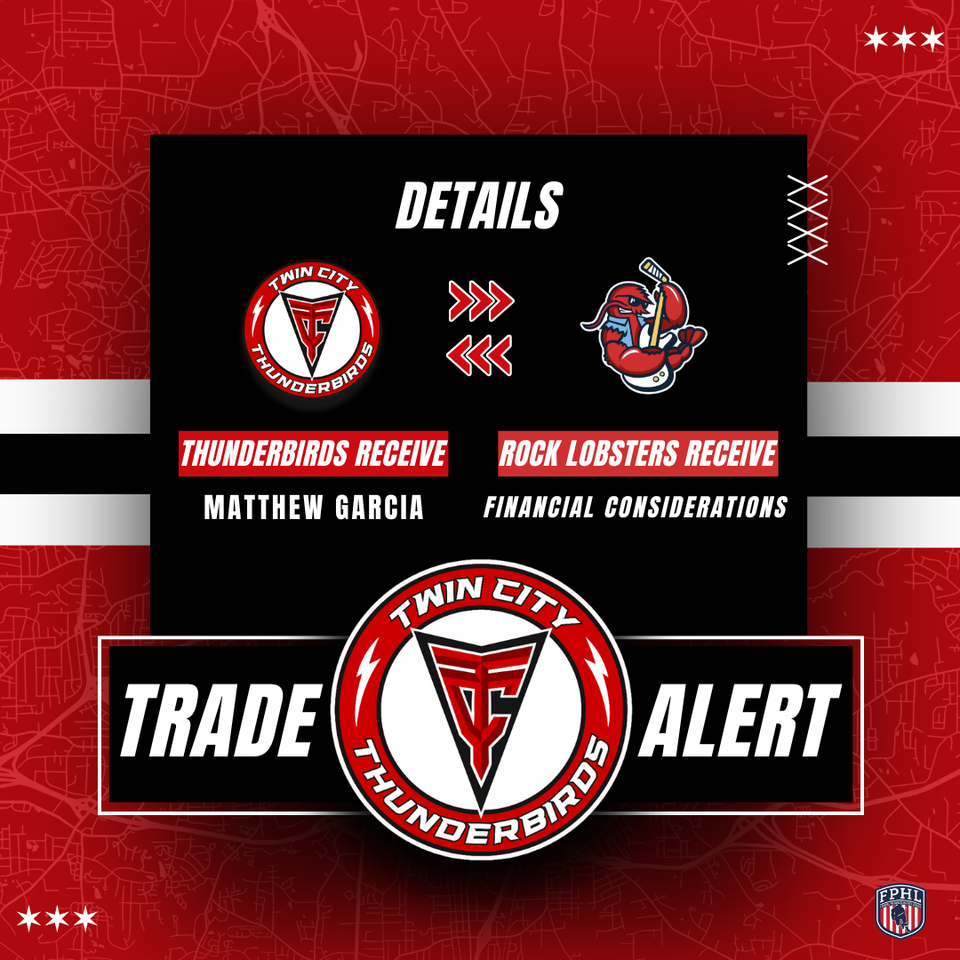 WINSTON-SALEM, N.C. – The Twin City Thunderbirds, proud members of the Federal Prospects Hockey League (FPHL), have acquired defenseman Matthew Garcia from the Athens Rock Lobsters in exchange for financial considerations.
