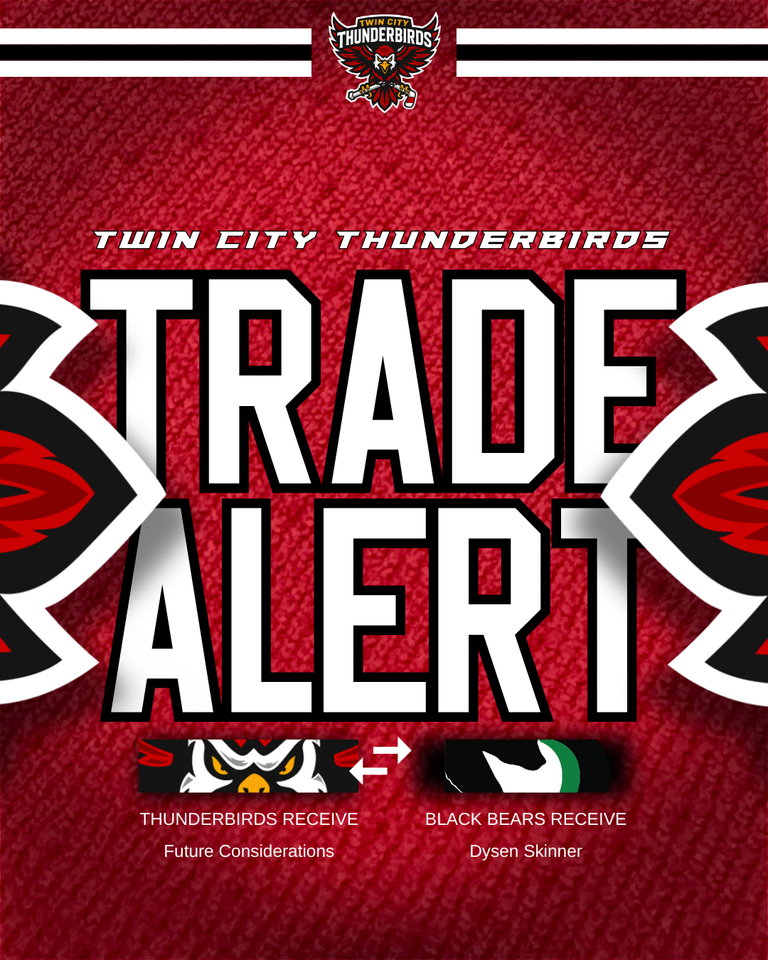 WINSTON-SALEM, N.C. – The Twin City Thunderbirds have completed a trade with the Binghamton Black Bears. Twin City has traded the rights to goaltender Dysen Skinner to Binghamton in exchange for future considerations. The transaction was completed ahead of today’s Federal Prospects Hockey League (FPHL) trade deadline.
