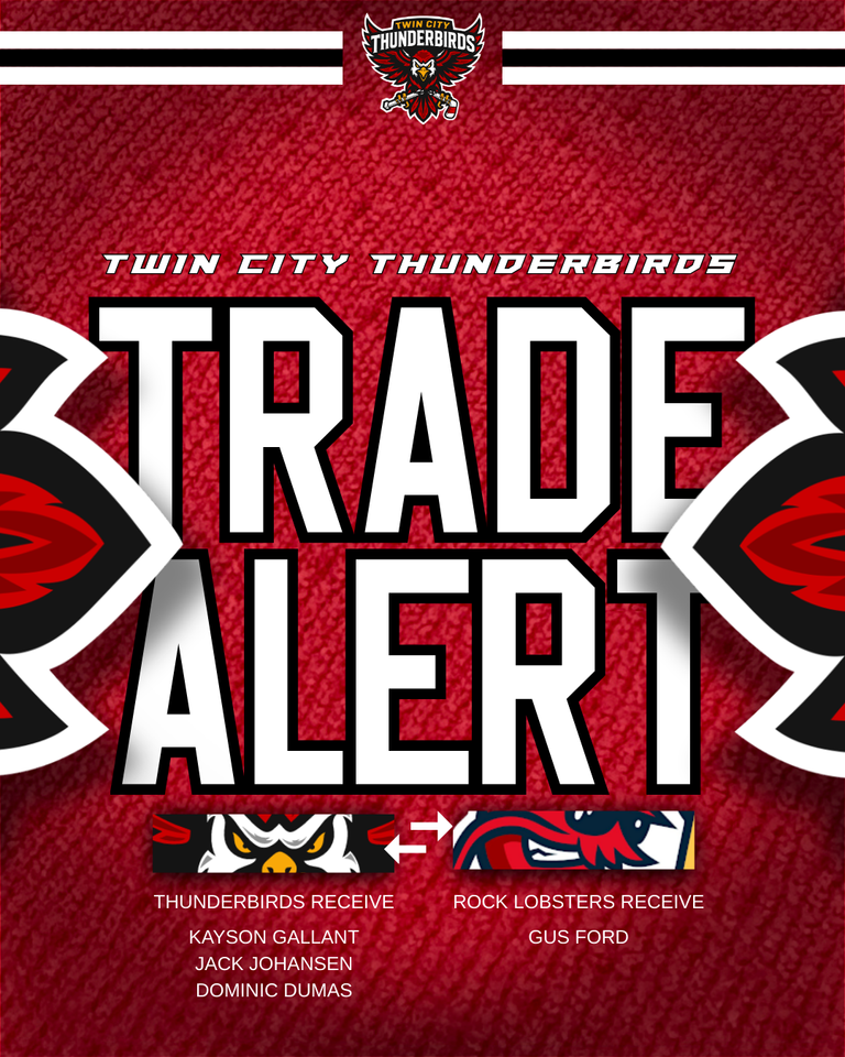 WINSTON-SALEM, N.C. – The Twin City Thunderbirds completed a transaction earlier today with the Athens Rock Lobsters. The Thunderbirds have acquired forward Kayson Gallant, defenseman Jack Johansen, and have reacquired forward/defenseman Dominic Dumas, from the Athens Rock Lobsters in exchange for forward Gus Ford. As part of the agreement, Ford’s rights will be returned to Twin City following the completion of the 2025-2026 season.