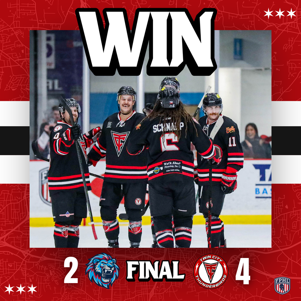 Jan Salak scored an unassisted goal with less than ten minutes to play in Saturday’s 3rd period. Salak’s goal gave the Thunderbirds a 4-1 lead in the matchup. The final goal of the game was netted by Pee Dee’s Trevor Lord with three minutes left to play. The goal was netted on the powerplay, and was scored with an extra attacker on the ice. Patriks Marcinkevics notched an assist on the goal. Twin City was outshot 14-2 during the 3rd period, 42-23 overall in the matchup, and won the game by a final score of 4-2. The Thunderbirds improved to 9-11-0 on the 2025-2026 season in the victory, and overtook the IceCats for 4th place in the FPHL’s Continental Division standings.