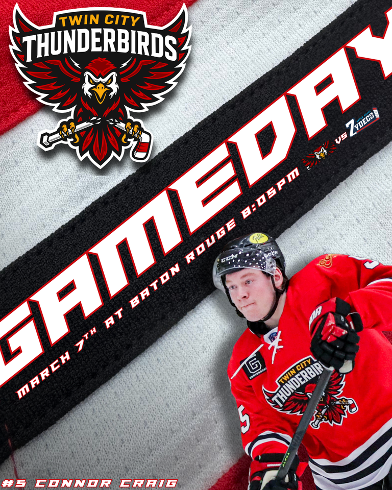 BATON ROUGE, LA. – The Twin City Thunderbirds seek another road victory over the Baton Rouge Zydeco following last night’s 3-2 win at the Raising Cane’s River Center. Nate Keeley, Roman Kraemer, and Connor Craig each netted a goal for Twin City during last night’s contest. Puck drop for tonight’s road game is scheduled for 8:05pm ET.