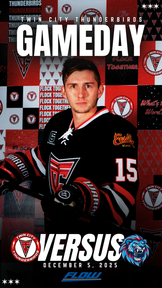 Twin City (4-10-0) returns to action tonight after dropping last weekend’s road matchups against the Danbury Hat Tricks and Binghamton Black Bears. The Thunderbirds fell to the Hat Tricks by a final score of 4-3 one week ago, and dropped a 5-4 decision last Saturday to the Black Bears. Jan Salak (2), Zach White, Gus Ford, Don Carter, Jacob Schnapp, and James Farmer scored goals for Twin City during last weekend’s road games. Scoring leaders for the Thunderbirds through the opening fourteen games of the 2025-2026 regular season include Gus Ford (9), Zach White (9), and Jan Salak (6). Twin City has won two of the first four games in this year’s thirteen-game series against Pee Dee.