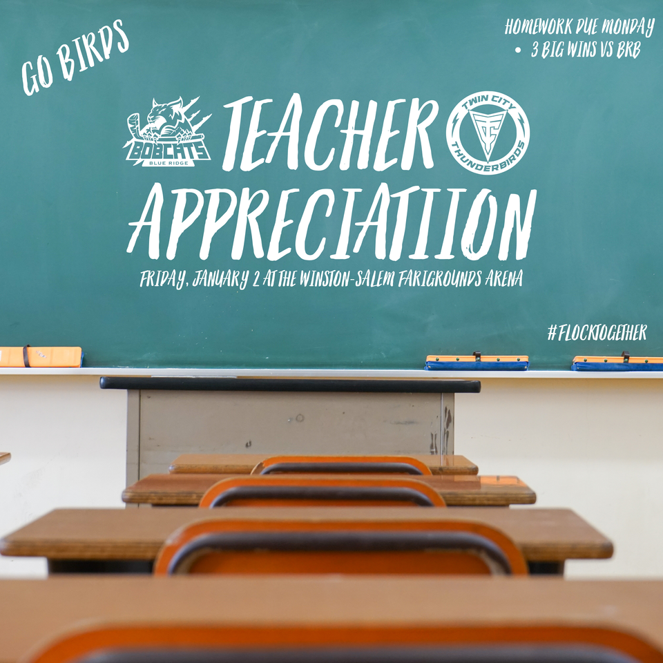 WINSTON-SALEM, NC. – The Twin City Thunderbirds are set to host the Blue Ridge Bobcats tonight at the Winston-Salem Fairgrounds Arena for Teacher Appreciation Night. Tickets may be purchased online by visiting WSFairgrounds.com, Ticketmaster.com, or by calling the Winston-Salem Fairgrounds Arena Box Office at (336) 727-2236. Puck drop for tonight’s game is scheduled for 7:35pm ET.