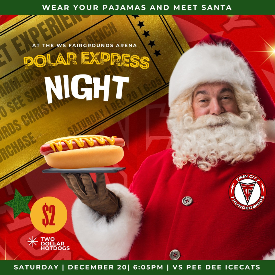 WINSTON-SALEM, NC. – The Twin City Thunderbirds are set to host Polar Express Night against the Pee Dee IceCats tonight on home ice. Fans are encouraged to wear their pajamas and visit with Santa during the game. The Winston-Salem Fairgrounds Arena will be offering special pricing for hot dogs ($2), and there will also be a public ice-skating session following the game. Tickets to the matchup are still available, and may be purchased online by visiting WSFairgrounds.com, Ticketmaster.com, or by calling the Winston-Salem Fairgrounds Arena Box Office at (336) 727-2236. Puck drop for tonight’s showdown between the Thunderbirds and the IceCats is scheduled for 6:05pm ET.