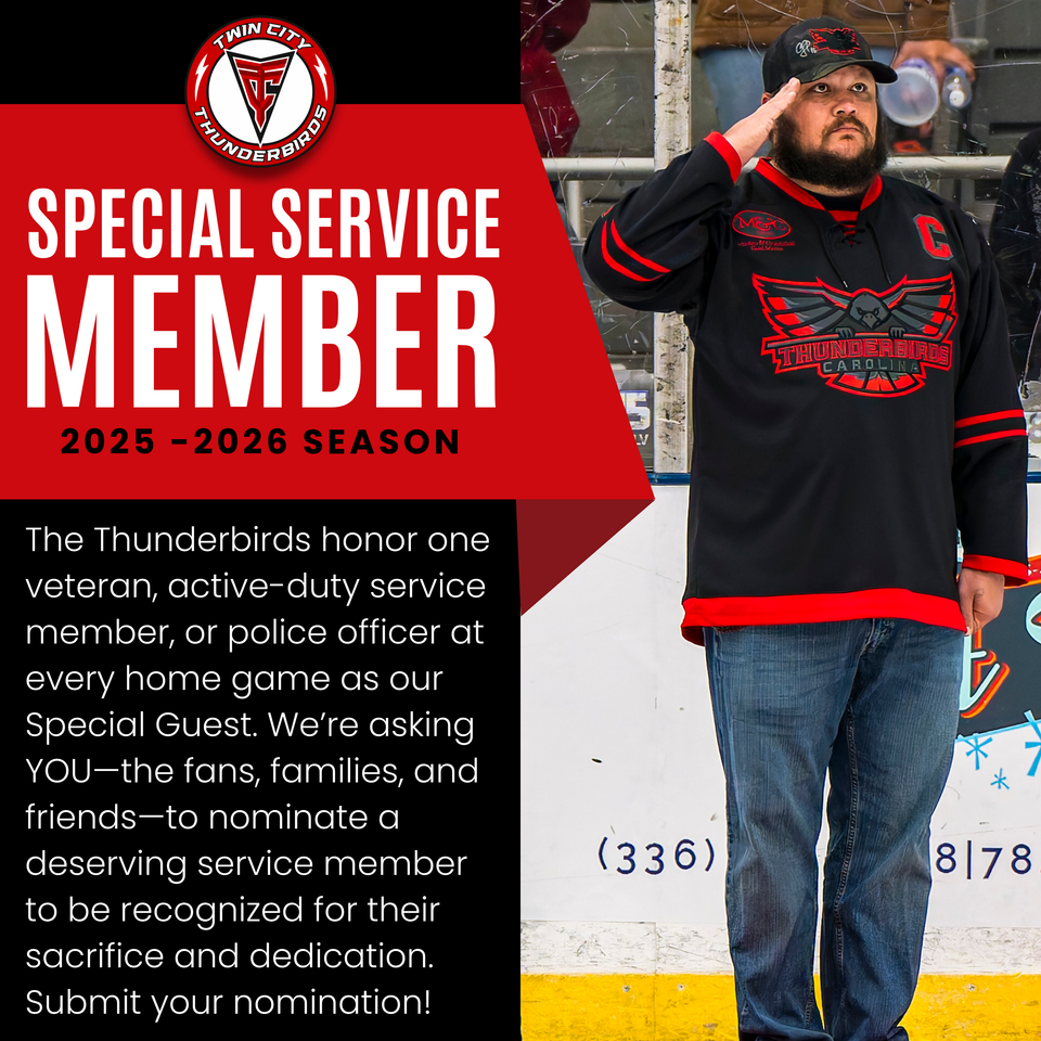 Fields marked with an * are required.error_outline Some fields contain errors Show {{form.showErrors ? 'Less' : 'More'}}keyboard_arrow_down {{error.field}} - {{error.message}} NameFirst NameLast NameEmailPhoneDate/Game Friday, October 17th, 2025 vs. Pee Dee IceCats Saturday, October 18th, 2025 vs. Pee Dee IceCats Friday, October 24th, 2025 vs. Blue Ridge Bobcats Friday, November 7th, 2025 vs. Columbus River Dragons Saturday, November 8th, 2025 vs. Columbus River Dragons Saturday, November 15th, 2025 vs. Blue Ridge Bobcats Friday, November 21st, 2025 vs. Pee Dee IceCats Saturday, November 22nd, 2025 vs. Pee Dee IceCats Saturday, December 6th, 2025 vs. Pee Dee IceCats Friday, December 12th, 2025 vs. Columbus River Dragons Saturday, December 13th, 2025 vs. Columbus River Dragons Saturday, December 20th, 2025 vs. Pee Dee IceCats Wednesday, December 31st, 2025 vs. Blue Ridge Bobcats Friday, January 2nd, 2026 vs. Blue Ridge Bobcats Saturday, January 3rd, 2026 vs. Blue Ridge Bobcats Friday, January 9th, 2026 vs. Binghamton Black Bears Saturday, January 10th, 2026 vs. Binghamton Black Bears Saturday, January 24th, 2026 vs. Blue Ridge Bobcats Friday, February 27th, 2026 vs. Watertown Wolves Saturday, February 28th, 2026 vs. Watertown Wolves Friday, March 13th, 2026 vs. Athens Rock Lobsters Friday, March 20th, 2026 vs. Biloxi Breakers Saturday, March 21st, 2026 vs. Biloxi Breakers Sunday, March 22nd, 2026 vs. Biloxi Breakers Friday, March 27th, 2026 vs. Athens Rock Lobsters Saturday, March 28th, 2026 vs. Athens Rock Lobsters Friday, April 3rd, 2026 vs. Pee Dee IceCats Friday, April 10th, 2026 vs. Blue Ridge BobcatsShort DescriptionPlease list time, rank, and a short description of your time in the service.PaymentDiscountSubtotalTaxTotal USDSubmitThank you for your interest in being recognized as a special service member of the Carolina Thunderbirds.